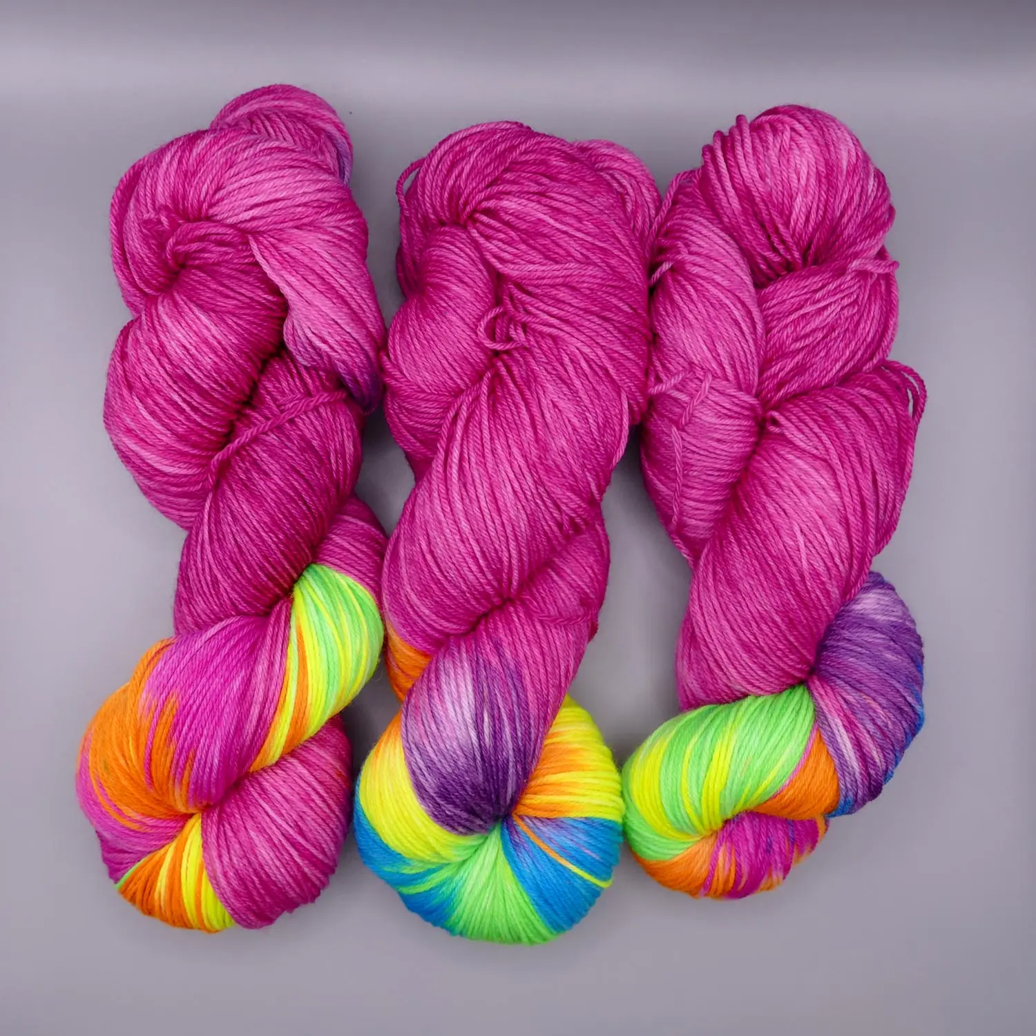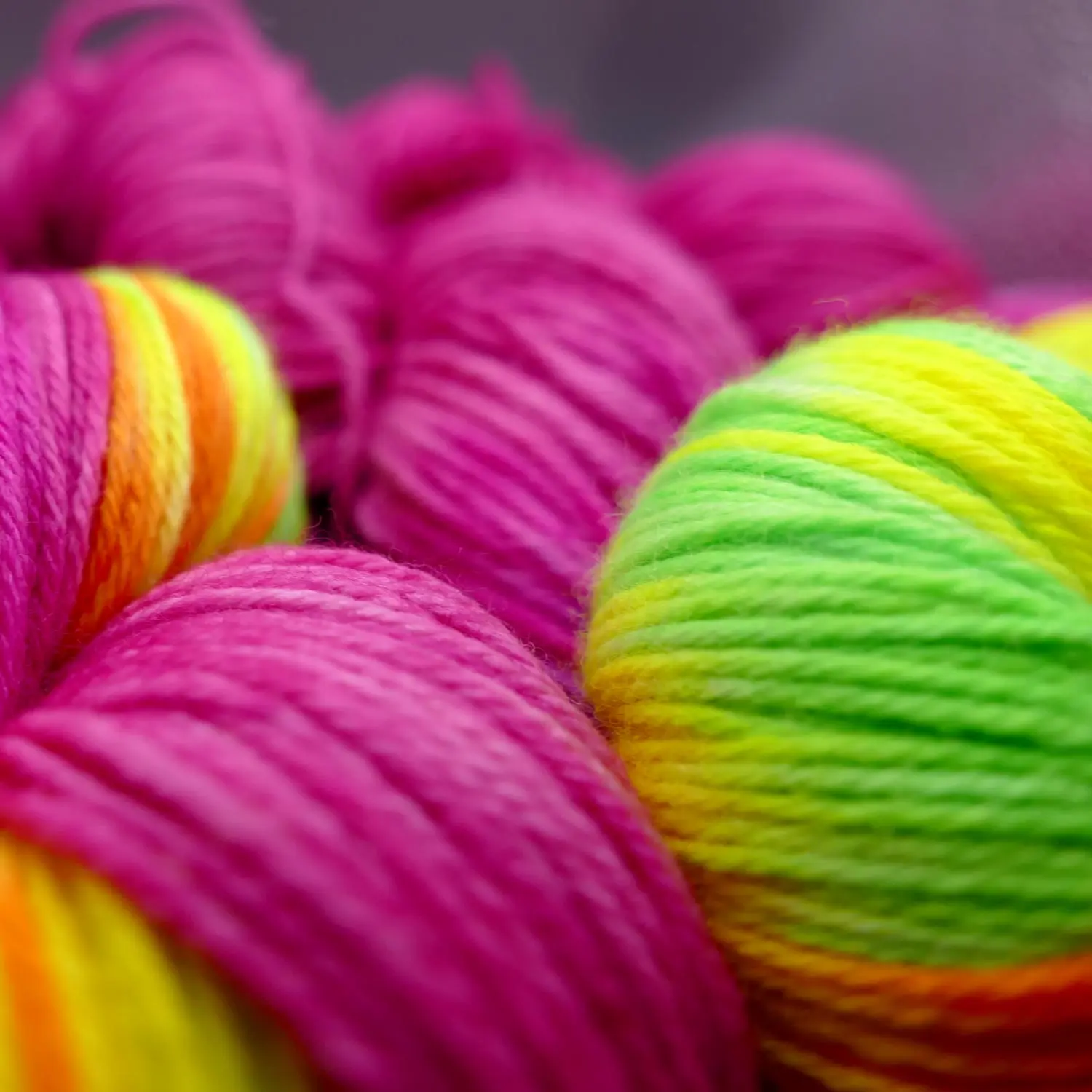 Bei den Aniwaniwa Färbungen gibt es immer eine dominierende Farbe, welche die knallige, neon-regenbogen-farbige Auswahl einschließt. Wird garantiert nicht langweilig beim stricken oder häkeln – nicht einmal beim angucken.