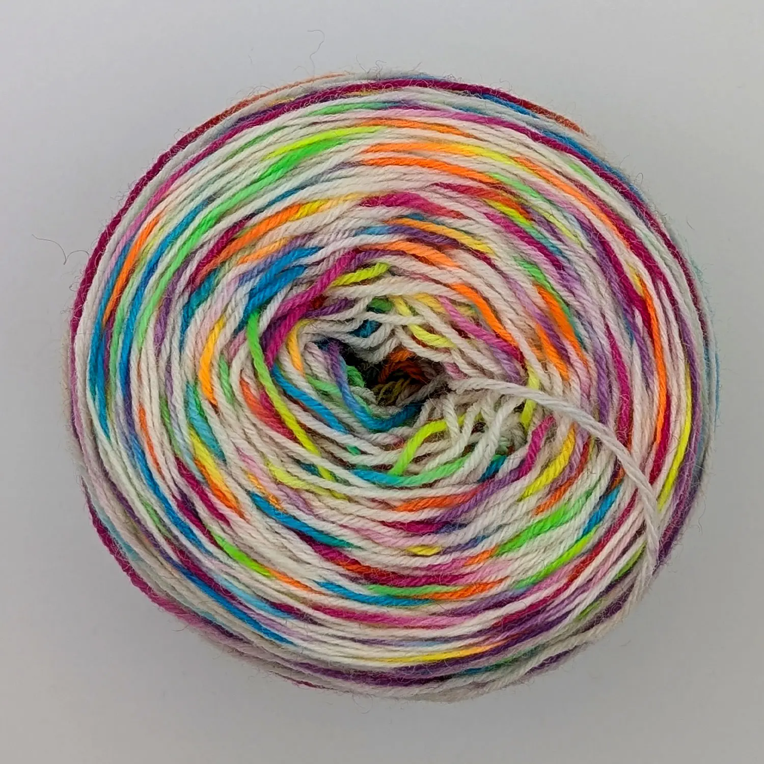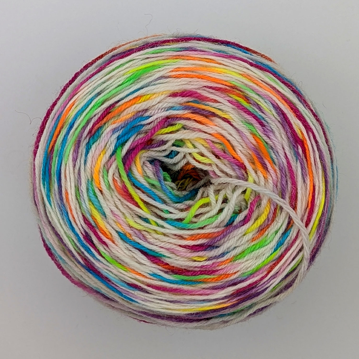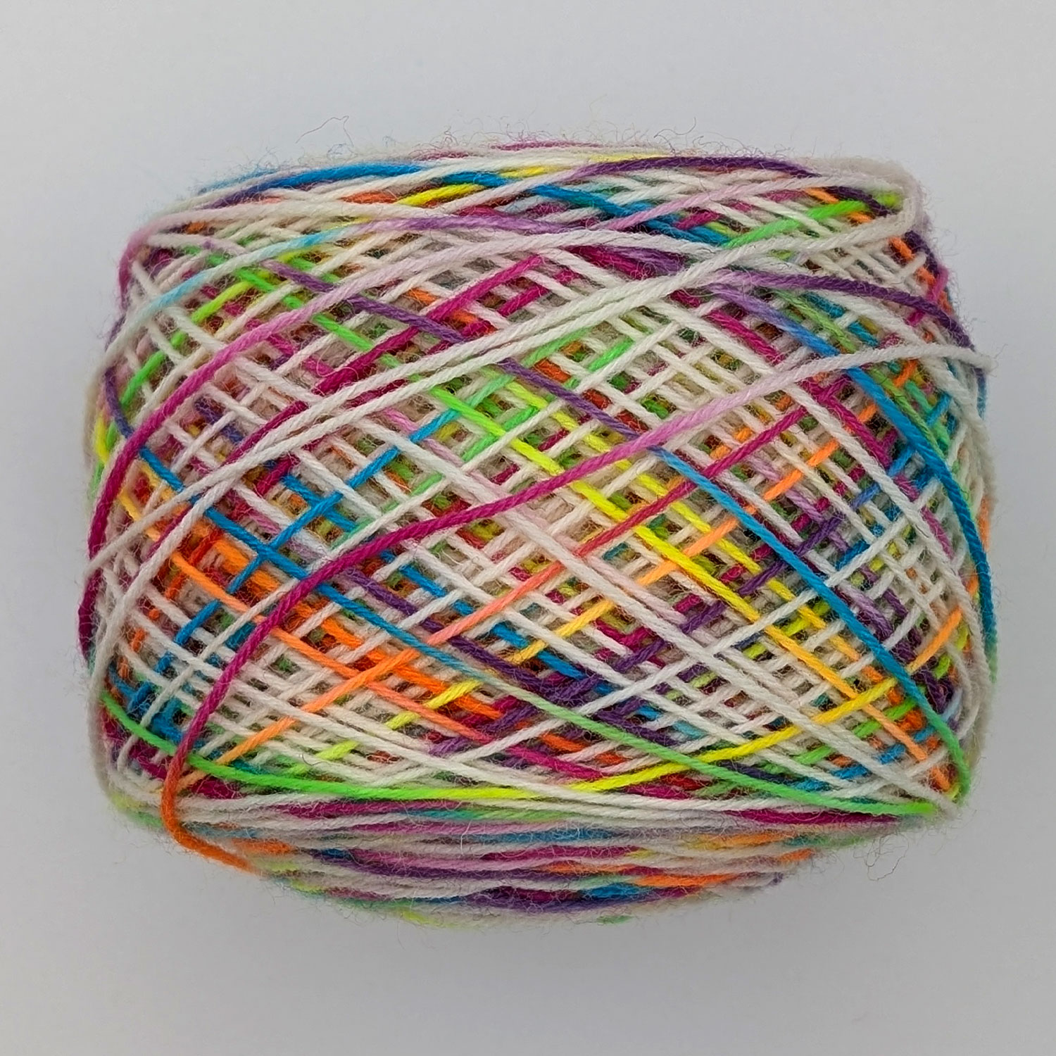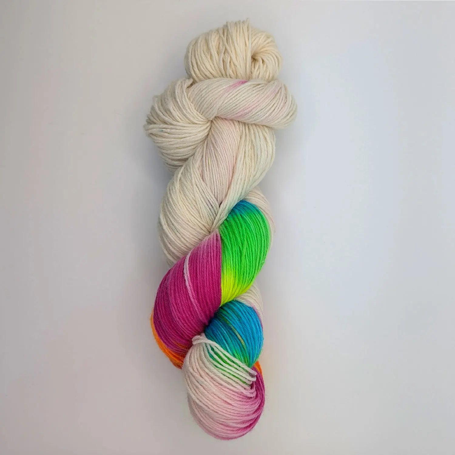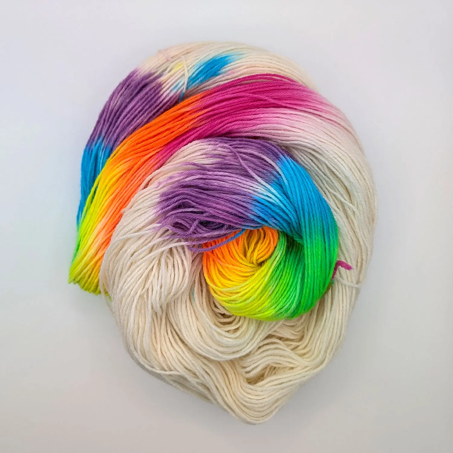 Bei den Aniwaniwa Färbungen gibt es immer eine dominierende Farbe, welche die knallige, neon-regenbogen-farbige Auswahl einschließt. Wird garantiert nicht langweilig beim stricken oder häkeln – nicht einmal beim angucken.