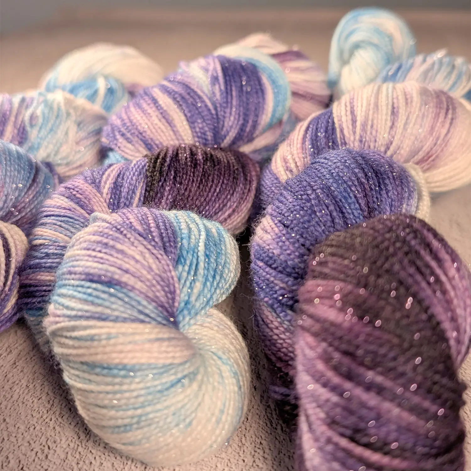 Kühle Wintertage, Eislaufen, Schnee und glitzernde Schneeflocken: Wie „Rudolph“ verbreitet auch unsere limitierte Wolldackel-Winterfärbung „Dancer“ in Hellblau, Violett, Helllila und Weiß – natürlich ebenfalls mit Glitzerfaden – luxuriöse Winter-Vibes.