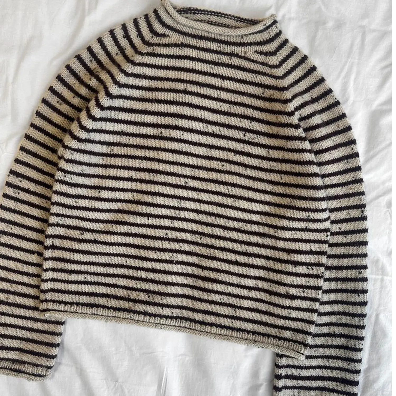 Der Frankie Sweater wird von oben nach unten mit Raglanzunahmen auf der Passe gearbeitet. Im Nacken erfolgen verkürzte Reihen, um den Halsausschnitt zu formen. Die Ärmel werden in Runden auf einem Nadelspiel oder mit einer Rundstricknadel gestrickt. Der Frankie Sweater wird mit schmalen Streifen gearbeitet.