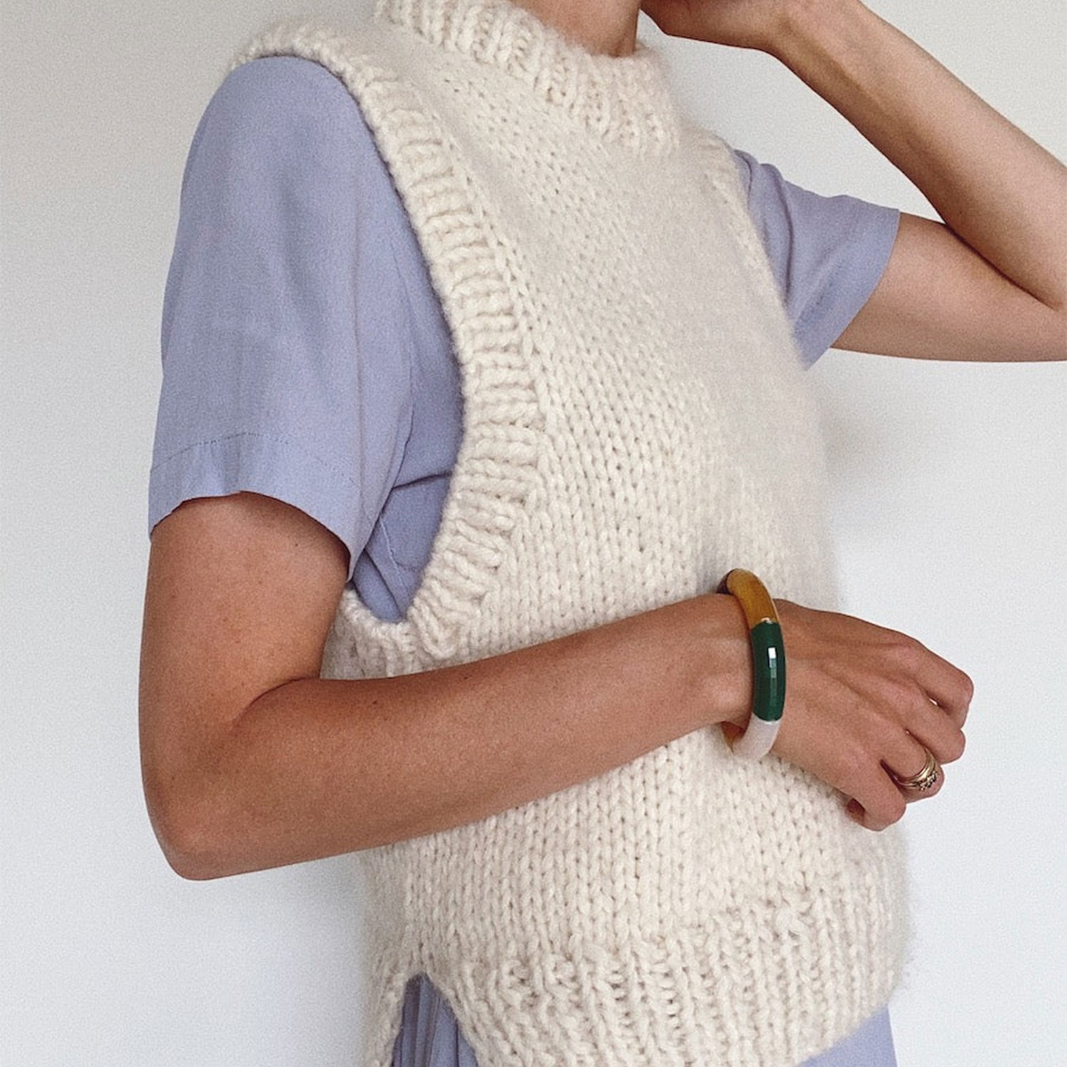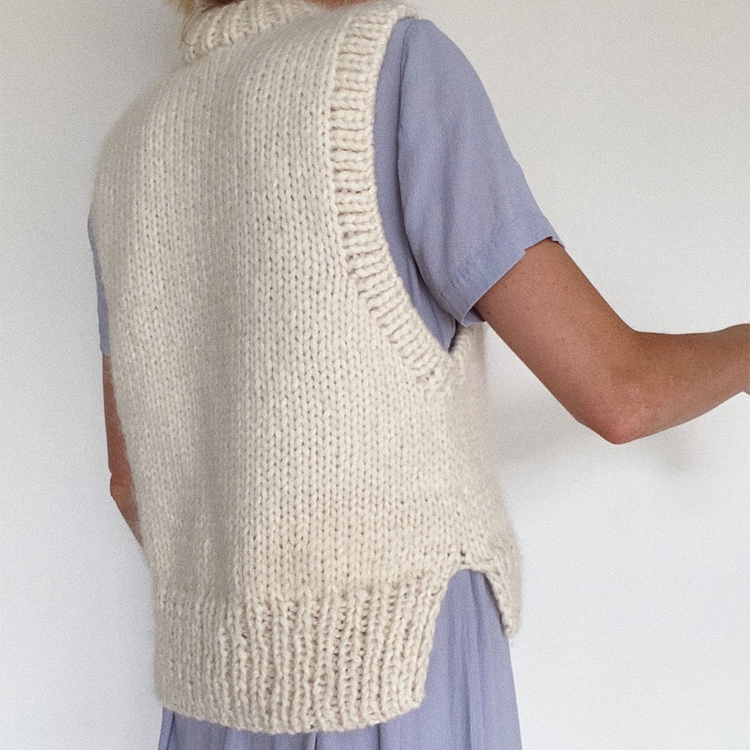 Der Holiday Pullunder ist ein grob gestrickter Pullunder mit einem tiefen Armausschnitt, der glatt rechts von oben nach unten gestrickt wird. Zuerst wird die Rückseite gearbeitet, danach die Schultern und die Vorderseite, zuletzt der Rumpf. Unten am Rumpf wird eine zweigeteilte Bündchenabschlusskante gestrickt, wobei die Kante auf der Rückseite länger als auf der Vorderseite ist. Entlang des Halsausschnittes und um die Armausschnitte herum werden zuletzt noch Abschlussbündchen gestrickt, die mit der italienischen Methode abgekettet werden, da dies das sauberste Ergebnis liefert.