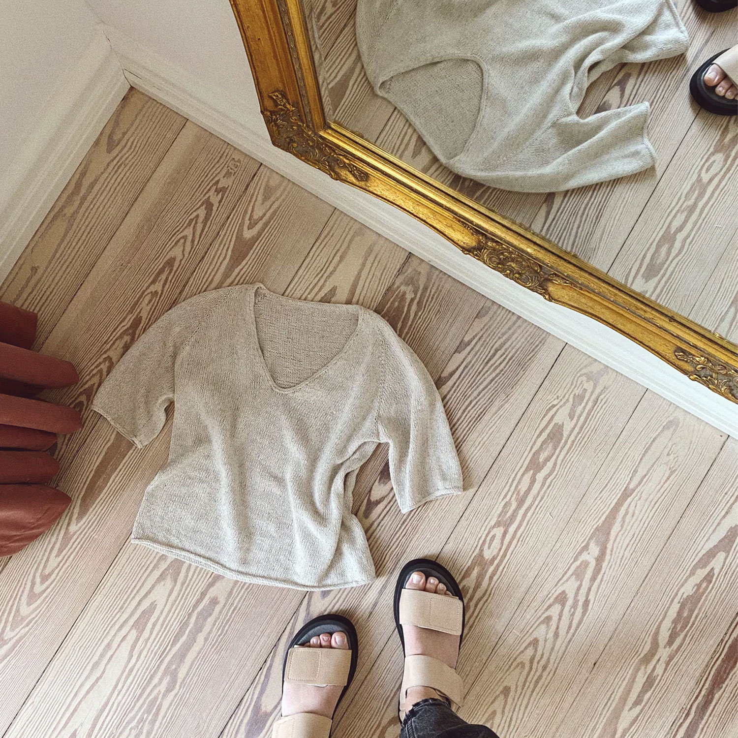 Das Kumulus Tee von PetiteKnit wird glatt rechts von oben nach unten laut Strickanleitung gestrickt und hat einen abgerundeten V-Ausschnitt vorne.