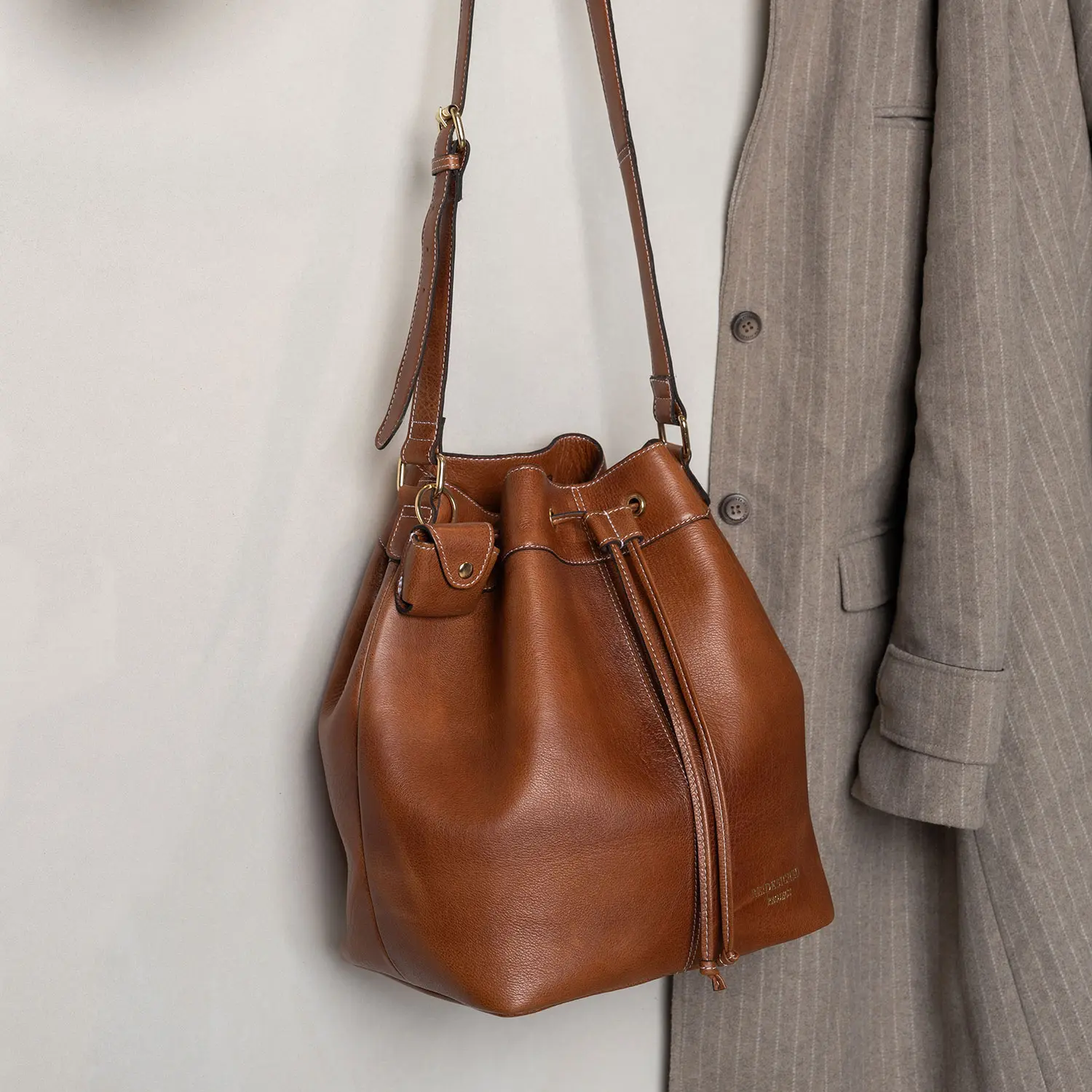 • Mit einer Innentasche mit Reißverschluss, offenen Fächern und einem stylischen Leder-Kordelzug