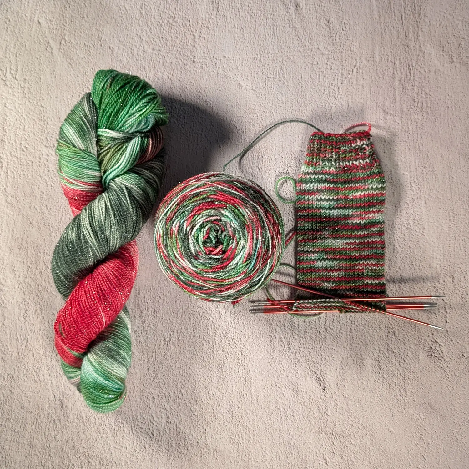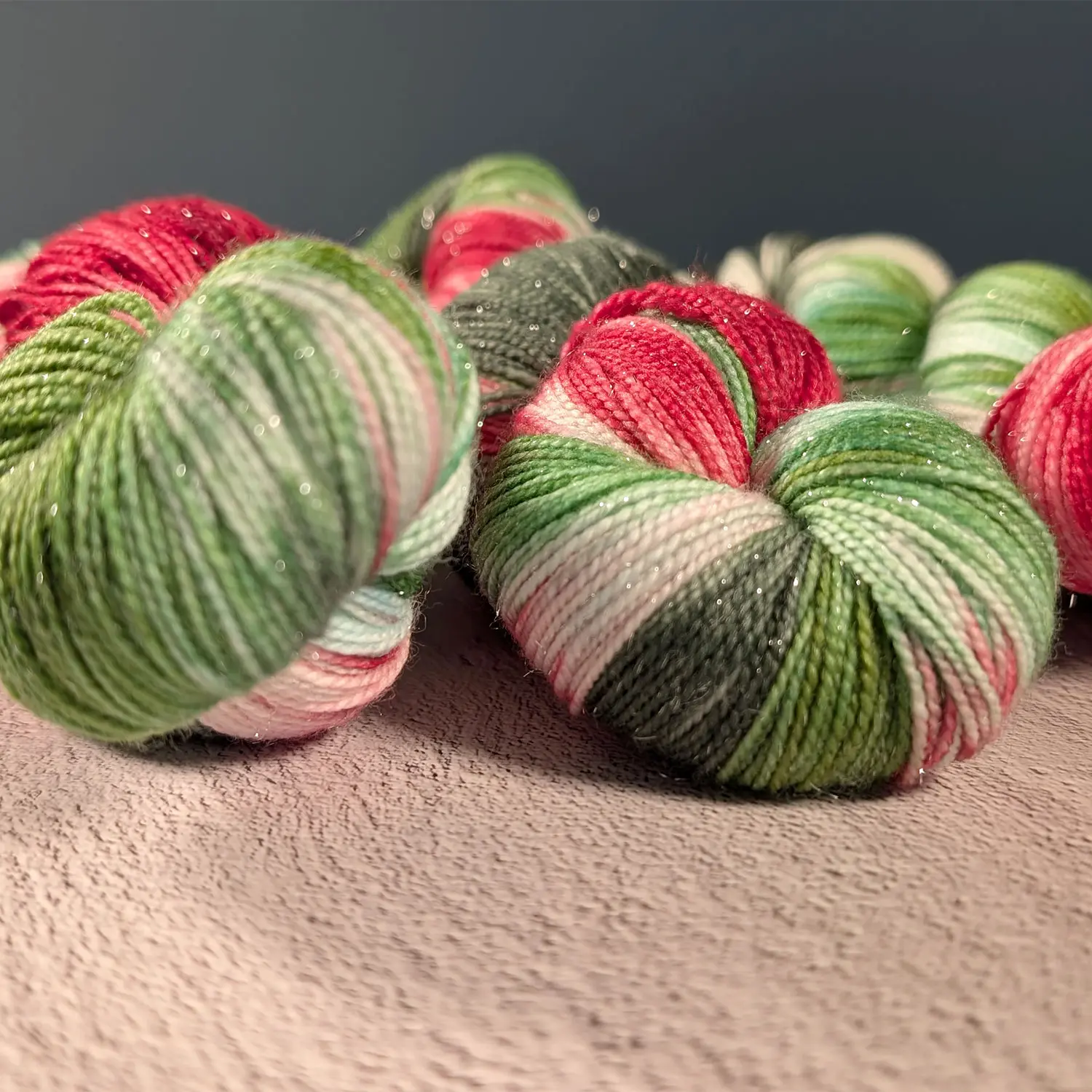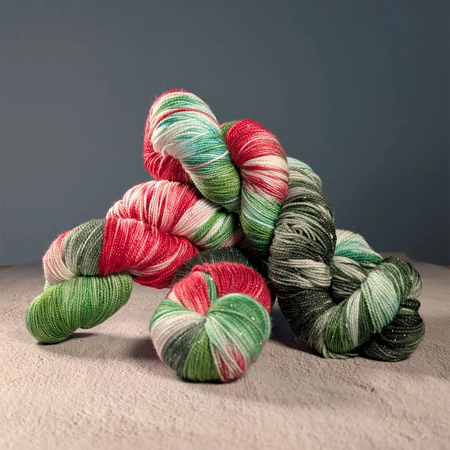 Handgefärbt in den Farben Rot, Grün (hell), Grün (dunkel) und Weiß lässt die Wolldackel-Winterfärbung „Rudolph“ sofort an die Festtage und Winter denken. Verstärkt wird dieser winterliche Effekt noch durch den feinen silbernen Glitzerfaden.