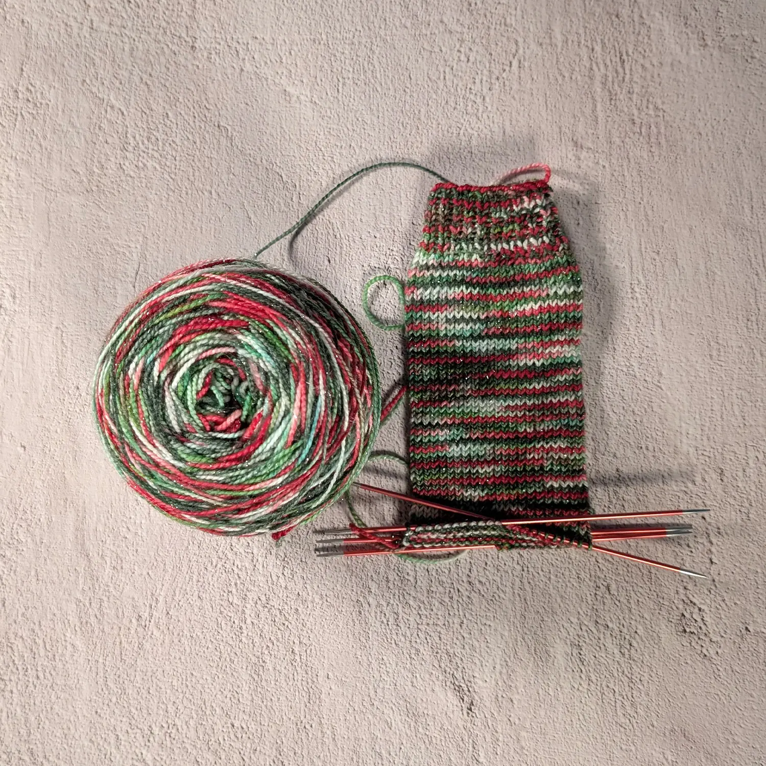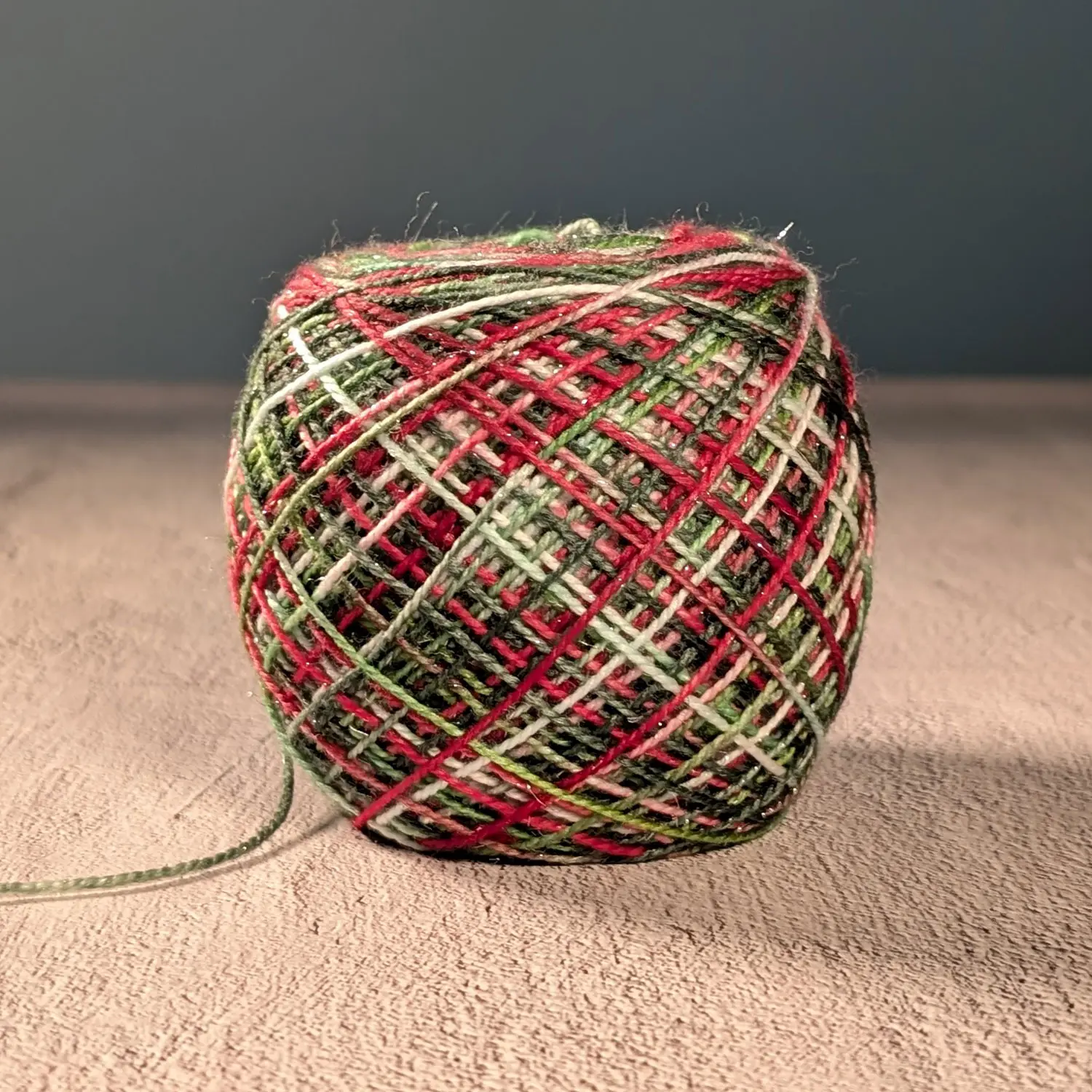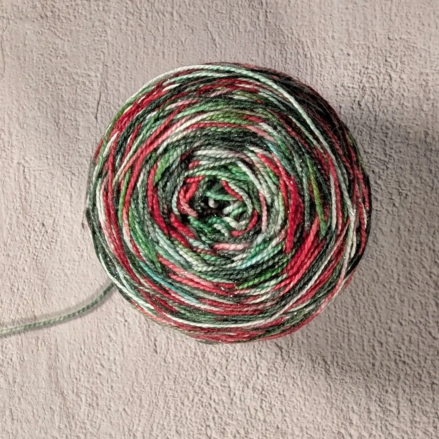 Handgefärbt in den Farben Rot, Grün (hell), Grün (dunkel) und Weiß lässt die Wolldackel-Winterfärbung „Rudolph“ sofort an die Festtage und Winter denken. Verstärkt wird dieser winterliche Effekt noch durch den feinen silbernen Glitzerfaden.