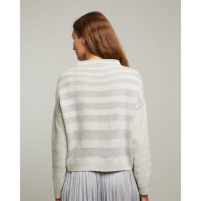 Der kastig geschnittene Pullover mit Stehkragen und überschnittenen Schultern wird von oben nach unten in einem sich verbreiternden Streifenmuster aus 2 verschiedenen Garnen gestrickt und mit dem Stehkragen begonnen, der später nach innen eingeschlagen und angenäht wird. Aus den Maschen des Stehkragens entstehen im weiteren Verlauf der Arbeit die M für Vorderteil, Rückenteil und die betonte Schulterlinie. Durch Zunahmen an beiden Seiten dieser Linie entwickelt sich die endgültige Breite von VT und RT, die von nun an bis zum unteren Ende der Armausschnitte getrennt in HR und RR gearbeitet werden. Anschließend werden beide Teile wieder zur Rd geschlossen und der Rumpf bis zum unteren Rand in Rd gearbeitet. Die Ärmel werden direkt an den Pullover angestrickt und ebenfalls in Rd gearbeitet.