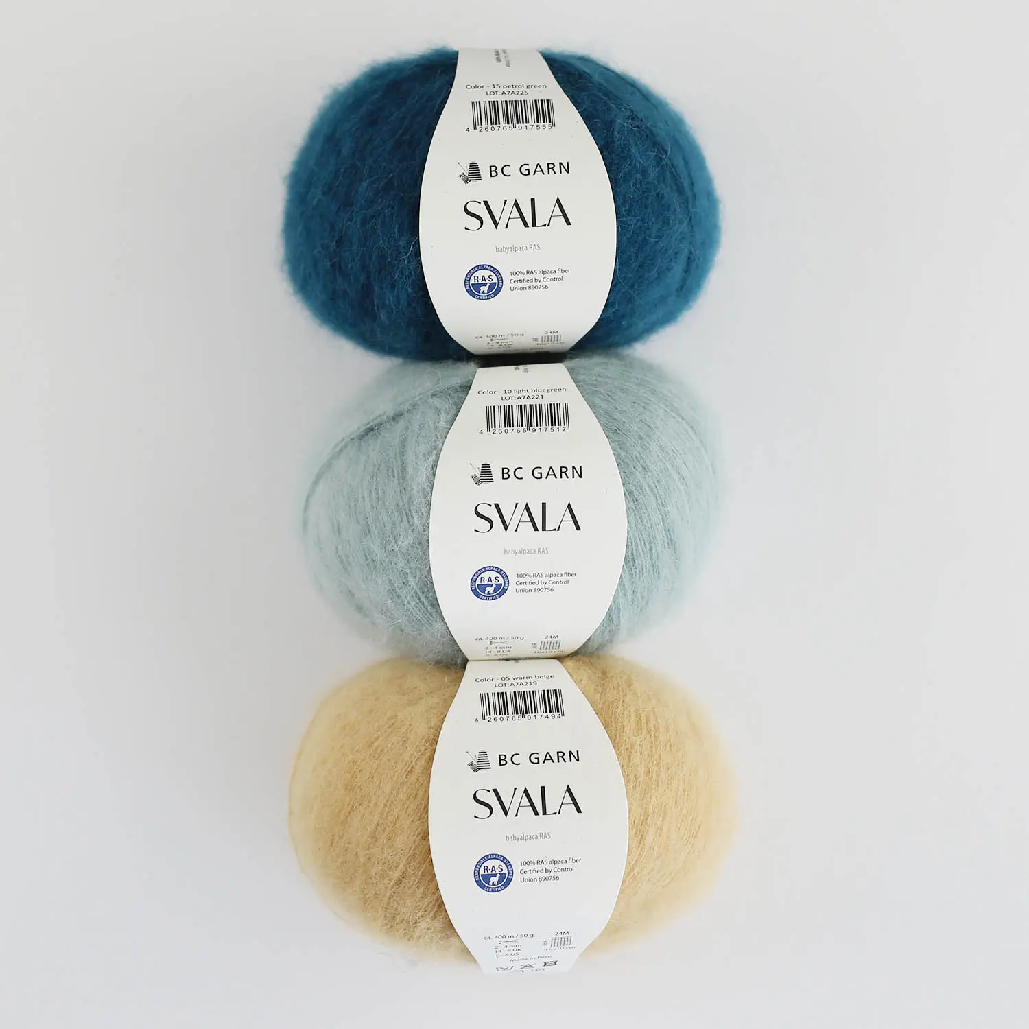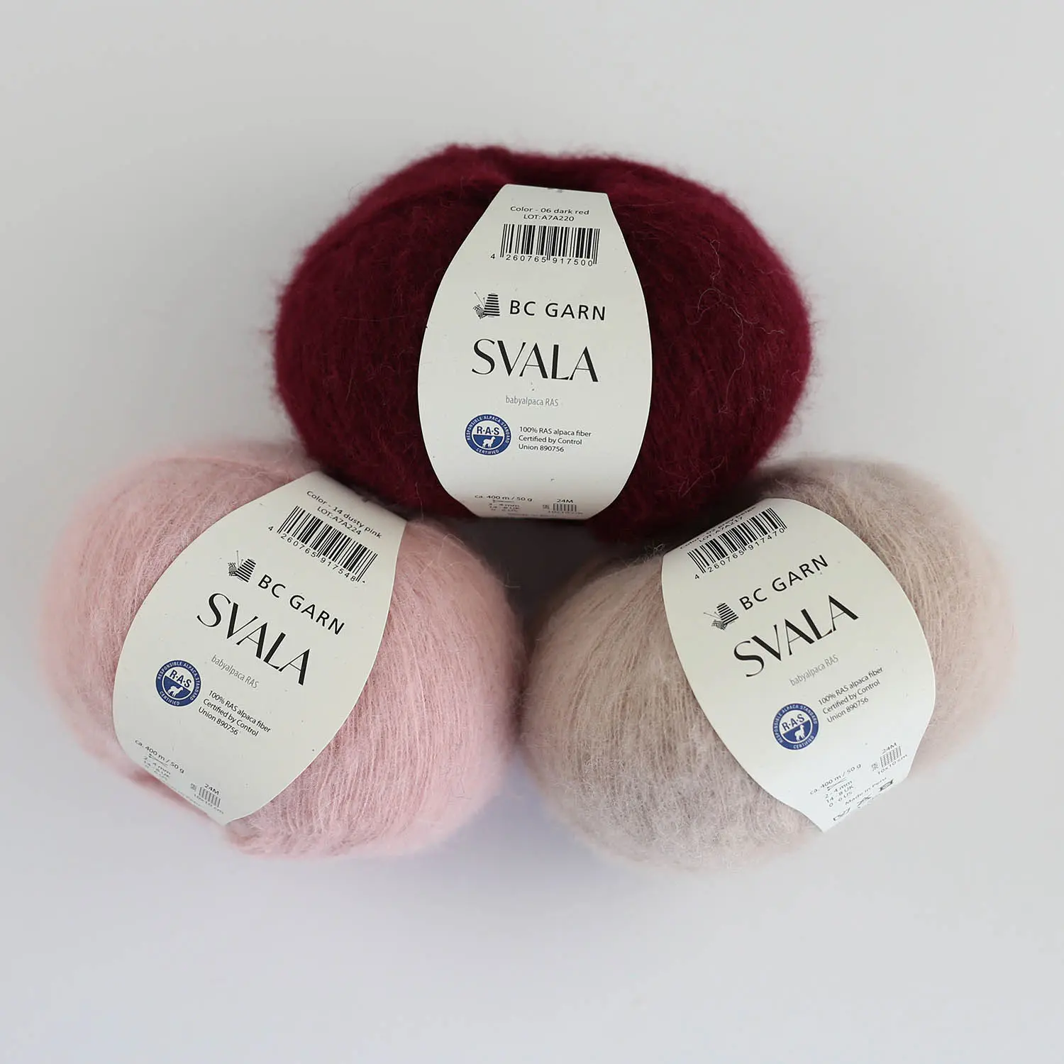 Svala von BC Garn – leicht, luftig und überraschend vielseitig! Eigentlich als Beilaufgarn gedacht, macht Svala auch solo eine fantastische Figur. Durch ein spezielles Spinnverfahren werden die weichen Alpakafasern (21–23 Micron) luftig und flauschig versponnen – aber mit einer entscheidenden Besonderheit: Der Faden bleibt formstabil und gibt dem Strickstück Halt. Kein klassisches Alpaka-Garn, das sich mit der Zeit aushängt, sondern eine echte Innovation!